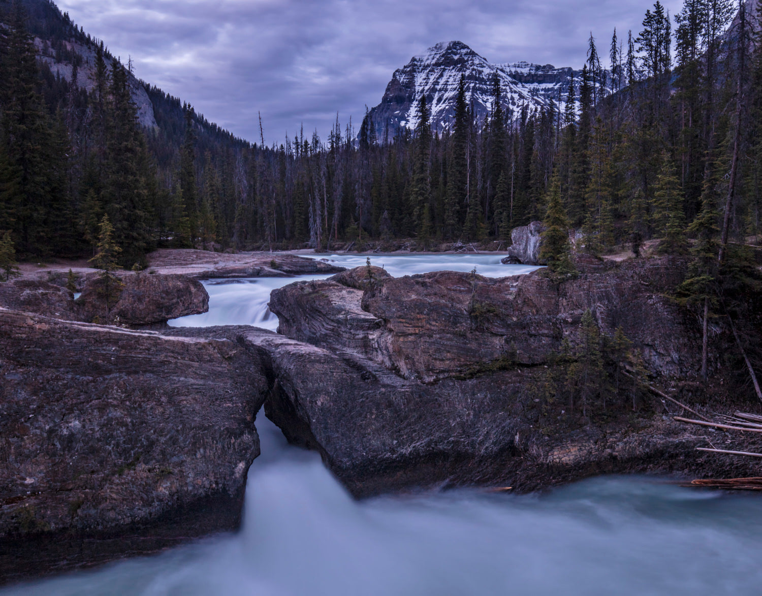 Carved through ancient stone, a river splits and surges with relentless grace. Towering pines stand witness to its journey while distant peaks keep silent watch. Here, the land is wild, the water is willful, and every fracture tells a story of time's quiet power.