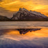 Beneath a fiery sky, the rugged peak stands in timeless stillness. Its reflection ripples softly in the lake below, capturing a fleeting moment where earth and sky seem to meet in perfect harmony.