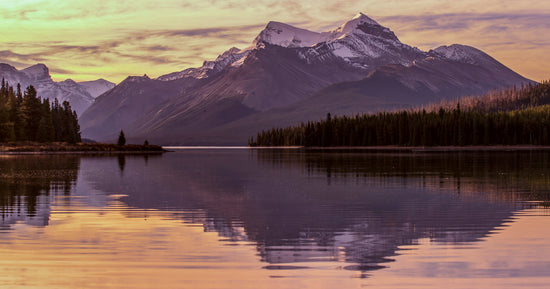 A serene mountain lake mirrors the violet hues of sunset, with snow-capped peaks rising beyond dense forests, painting a moment of perfect stillness.