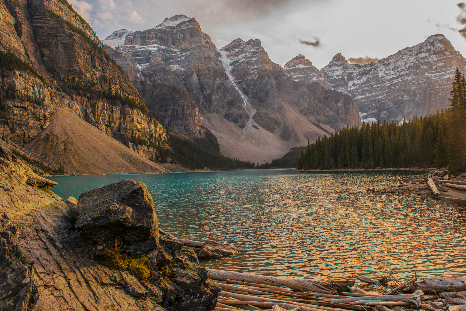 Golden light spills across the emerald surface of Moraine Lake, embraced by towering peaks and rugged cliffs dusted with snow. Fallen logs rest gently at the shoreline, adding texture and depth to the scene. The tranquil waters mirror the grandeur of the mountains, evoking a profound sense of calm amidst nature’s dramatic beauty.