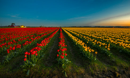 A breathtaking view of vibrant tulip fields in full bloom, with rows of red and yellow flowers stretching toward the horizon under a deep blue sky at sunset. The scene radiates color and harmony, bringing a sense of joy and beauty to any home or office decor.