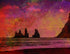 Sea stacks rise like sentinels from the North Atlantic, silhouetted against a sky ablaze with magenta, gold, and violet. Layered textures and dreamy hues bring the Icelandic shore to life in a way that feels both mythic and modern. A bold tribute to nature’s raw poetry.