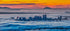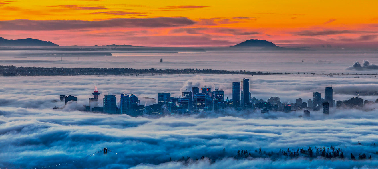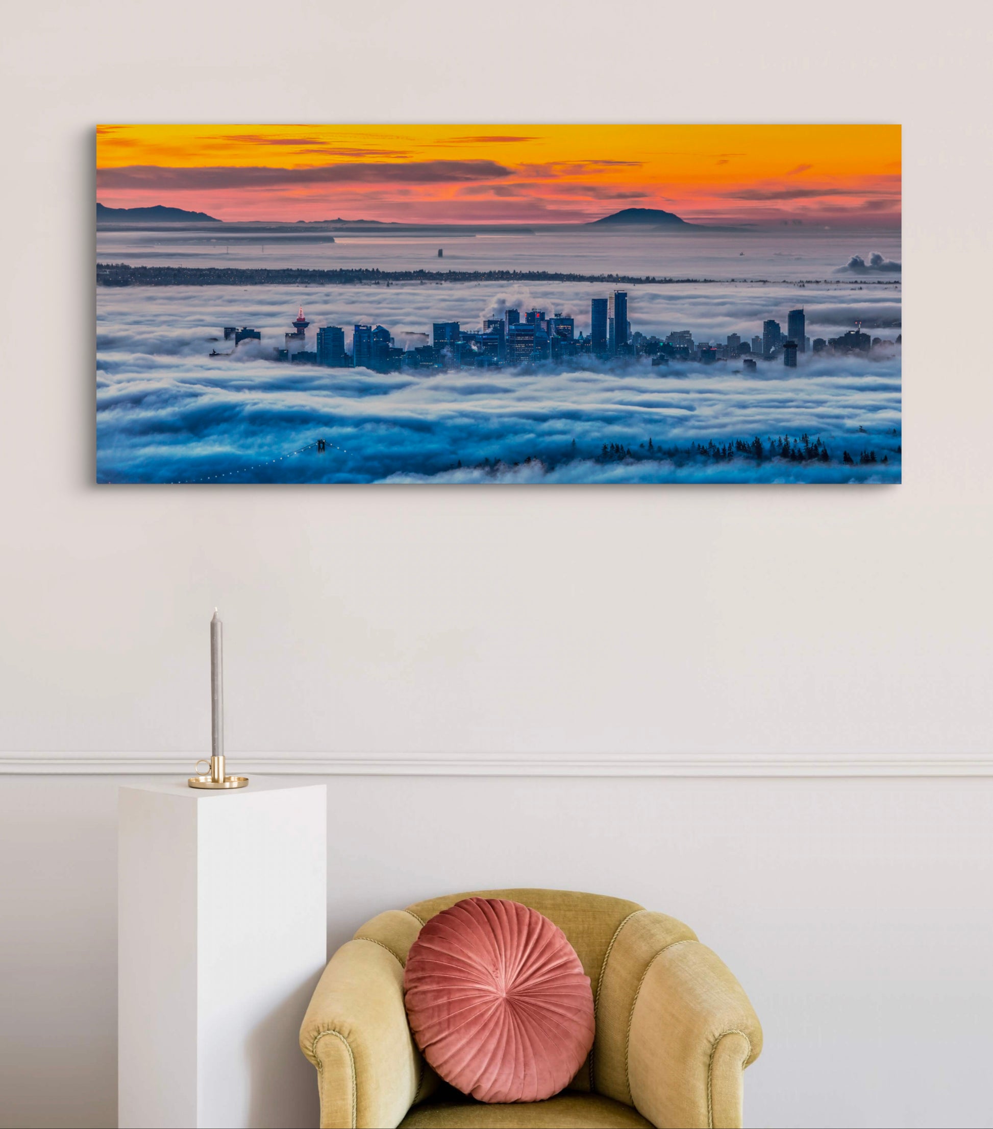 A stunning panoramic view of a city skyline emerging through a blanket of fog at sunrise. The glowing orange sky contrasts beautifully with the cool mist, capturing the serene yet powerful energy of urban life meeting nature. A perfect statement piece for modern spaces and city lovers.