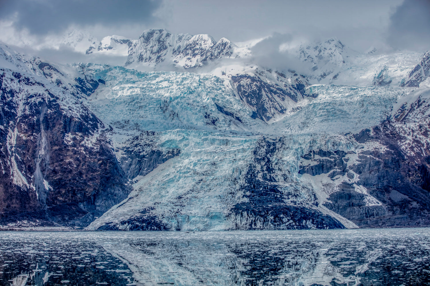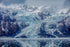 Multiple layers of glacier ice descend the rugged cliffs, flowing steadily toward the icy waters below. The glacier’s blue hues shimmer beneath an overcast sky, with mist and clouds weaving through jagged snow-covered peaks, creating a breathtaking scene of cold, untamed beauty.