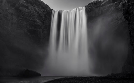 A smooth cascade plunges from a towering cliff, shrouded in mist and shadow. Bold. Unyielding. Timeless.