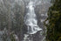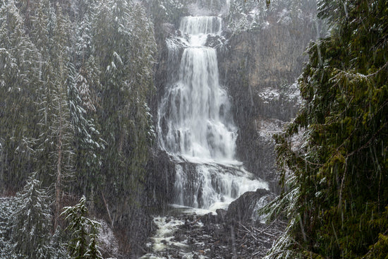 Amid towering evergreens, a cascade tumbles through a curtain of snow. The forest breathes in quiet rhythm, where water, ice, and mist converge in a fleeting dance of nature’s resilience.