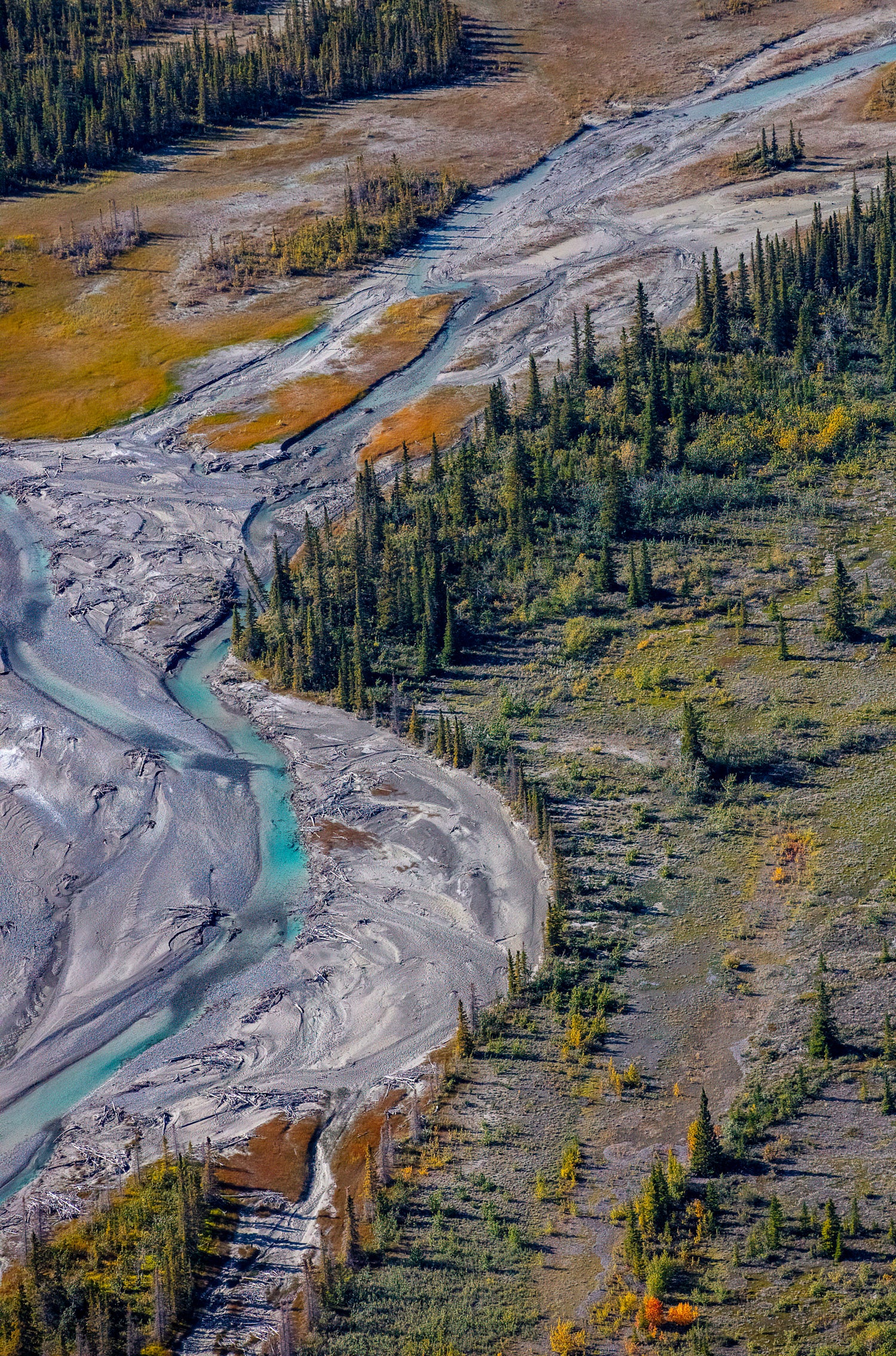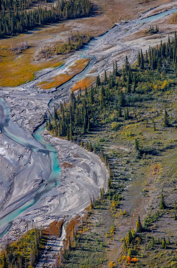 Carved by centuries of glacial breath, this braided river winds like liquid silver across a rugged plain. Pines stand like watchmen along its edge, where turquoise currents whisper tales of retreating ice and ancient land.