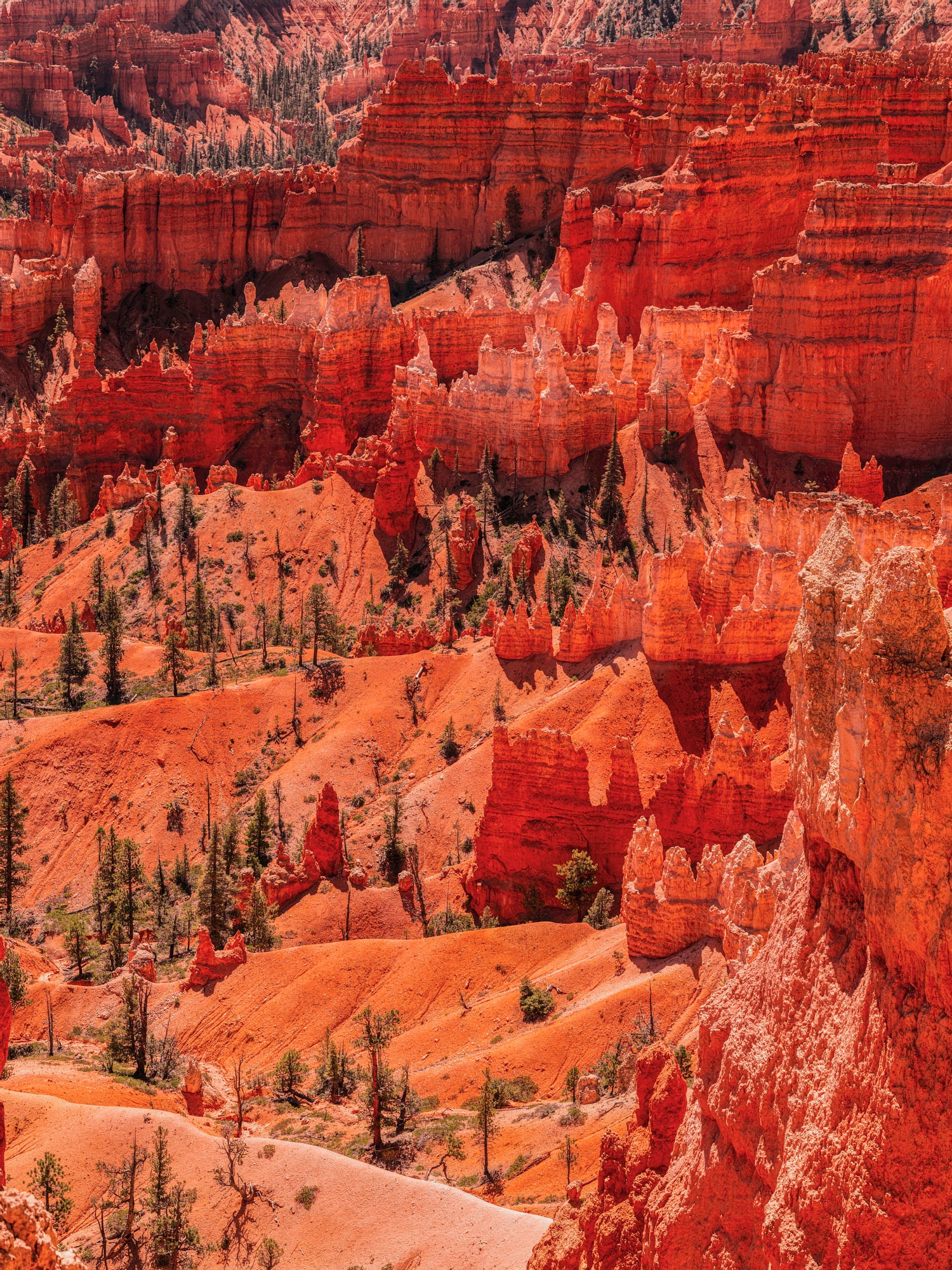 A stunning landscape of Bryce Canyon, showcasing its towering red rock formations and intricate spires under bright sunlight. The vivid colors and dramatic textures of this natural wonder bring warmth and bold beauty to any space.