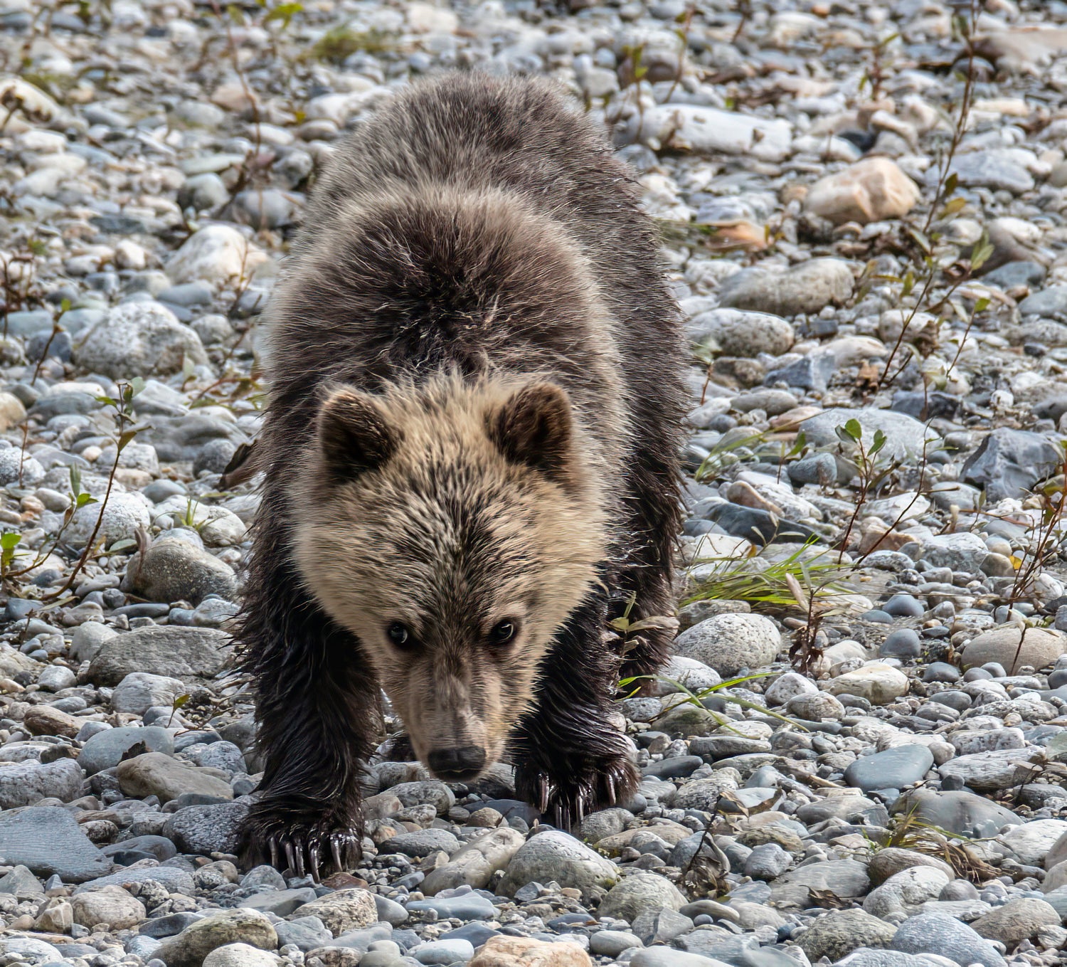 An adorable young grizzly bear making its way across a rocky riverbed, with curiosity and determination in its gaze. The natural textures and playful energy of this scene bring a lively and heartwarming touch to any wildlife or nature themed space.